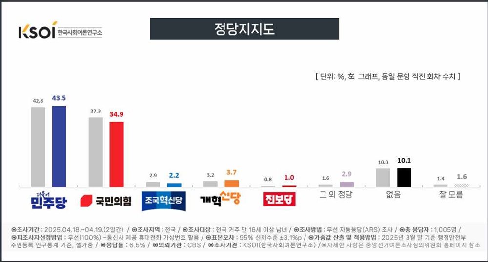 특히 중도층에서는 민주당 43.5%, 국민의힘 34.9%로 차이를 보이고 있어요.