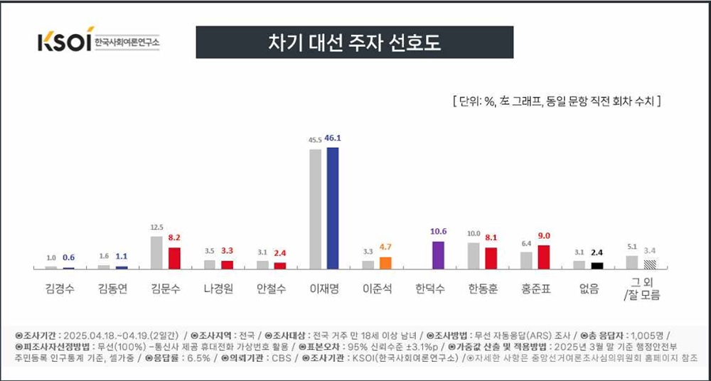 2025년 조기 대선 여론조사: 이재명 선두, 야권 후보 분산 양상